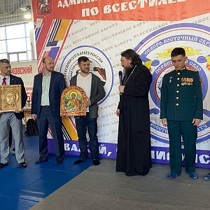Отец Павел выступил перед собравшимися с напутственным словом, благословив участников и вручив резные иконы Спасителя и благоверного князя Александра Невского представителям организаторов.